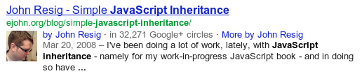 Google is piloting the display of author information in search results to help users discover great content. Check out these sample queries: [steven levy google plus], [chlorine based life], [madonna], [britney spears], [google authorship], [david pogue nytimes], [pete wentz], [javascript inheritance].